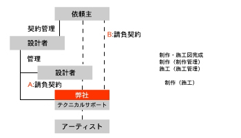 アートワーク・アート計画・ランド“アート”スケープに関した設計・設計協力及び提案の流れ 1.基本調査/基本計画 弊社データベースによるアートプロジェクト事例研究(約800事例) 弊社データベースによるアーティストリスト作成(約1.300作家) 2.基本・実施設計(意匠/技術/制作・施工計画・積算) 3.制作・施工 ポジショニング 計画・設計段階での弊社のポジショニング A:都市計画・建築設計に関連したアート計画・アートワーク等の設計(制作・施工)をする場合 B:(都市計画・建築設計は別に)単独でアート計画・アートワークの設計(制作・施工)をする場合 工事段階での弊社のポジショニング A:都市計画・建築設計に関連したアート計画・アートワーク等の設計(制作・施工)をする場合 B:(都市計画・建築設計は別に)単独でアート計画・アートワークの設計(制作・施工)をする場合