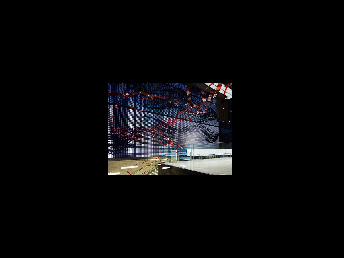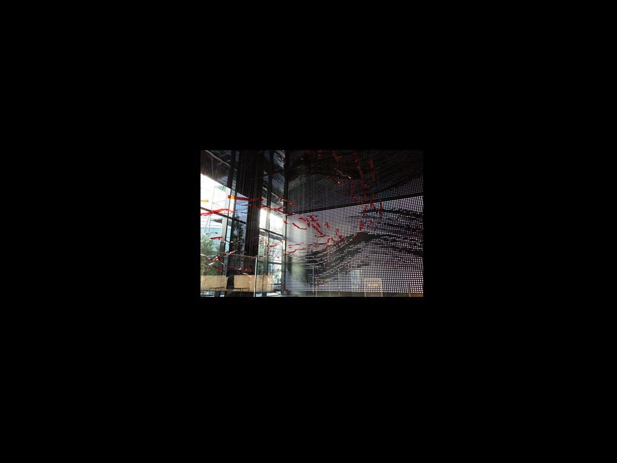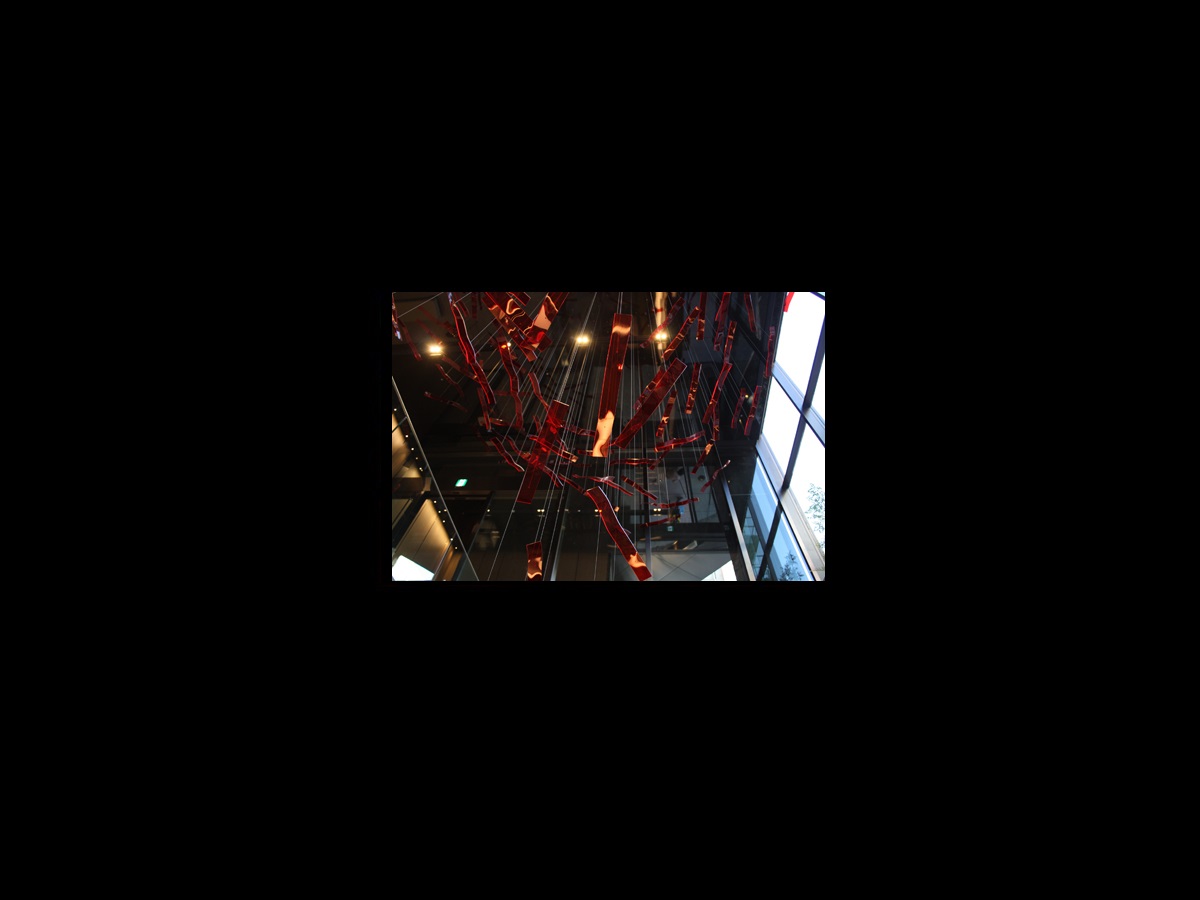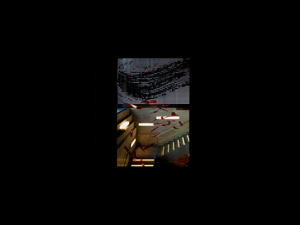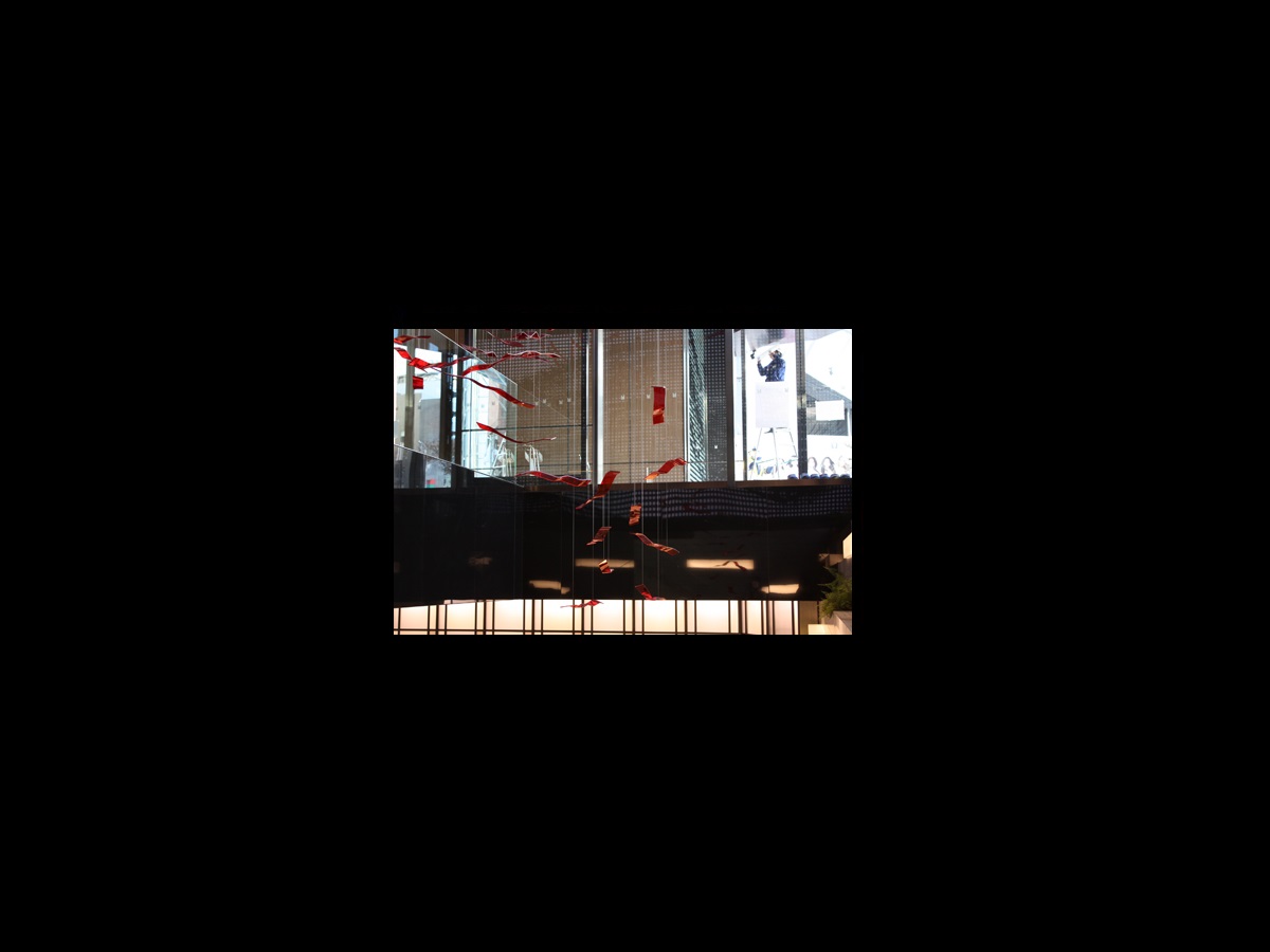 エントランスホールに入ったらまず目に飛び込む、華やかな吊り作品。 4種類の異なった長さのアクリルアートピース178枚を、256本のワイヤーで天井より吊って空間を構成。 青龍ならぬ、「赤い龍」がホテルの空間を昇降しているイメージ。 それはホテルロビーより、ゲストを地下のレストランへ誘う導線をなぞり またホテルの守り神のように回遊する。