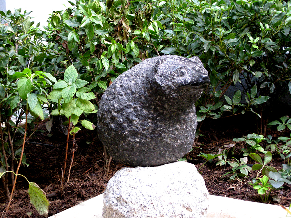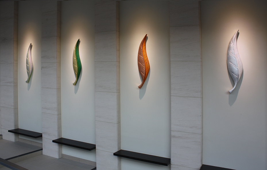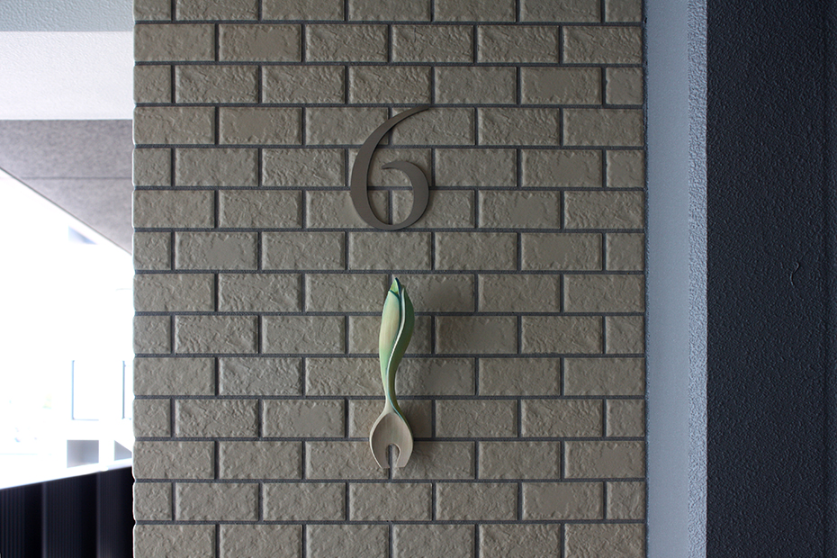 (大倉山の)森は「大きな住まい」とのアートテーマをもとに構成されたアート計画。「森の出会い」「森の息吹き」「森のやすらぎ」とつづく一連の作品の最後のテーマは「森のめぐみ」。中庭のヒマラヤ杉の足元に「松ぼっくり」をモチーフにした作品。秋には本物の松ぼっくりとアートが共存する風景が出現する。エントランスホールの壁面には「帰り」と「行き」の表情の違うテクスチャーで変化をつけた木ベースの作品。作品の半分の仕上げを変えて「帰り」は入口から順に「アルミ箔(春)」「金箔(夏)」「ブロンズ箔(秋)」「プラチナ箔(冬)」を楽しみ、「行き」は春夏秋冬をイメージした色彩のペイントを施した作品。