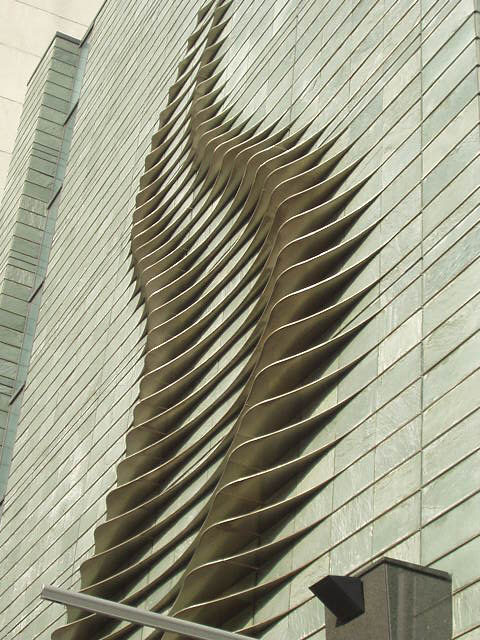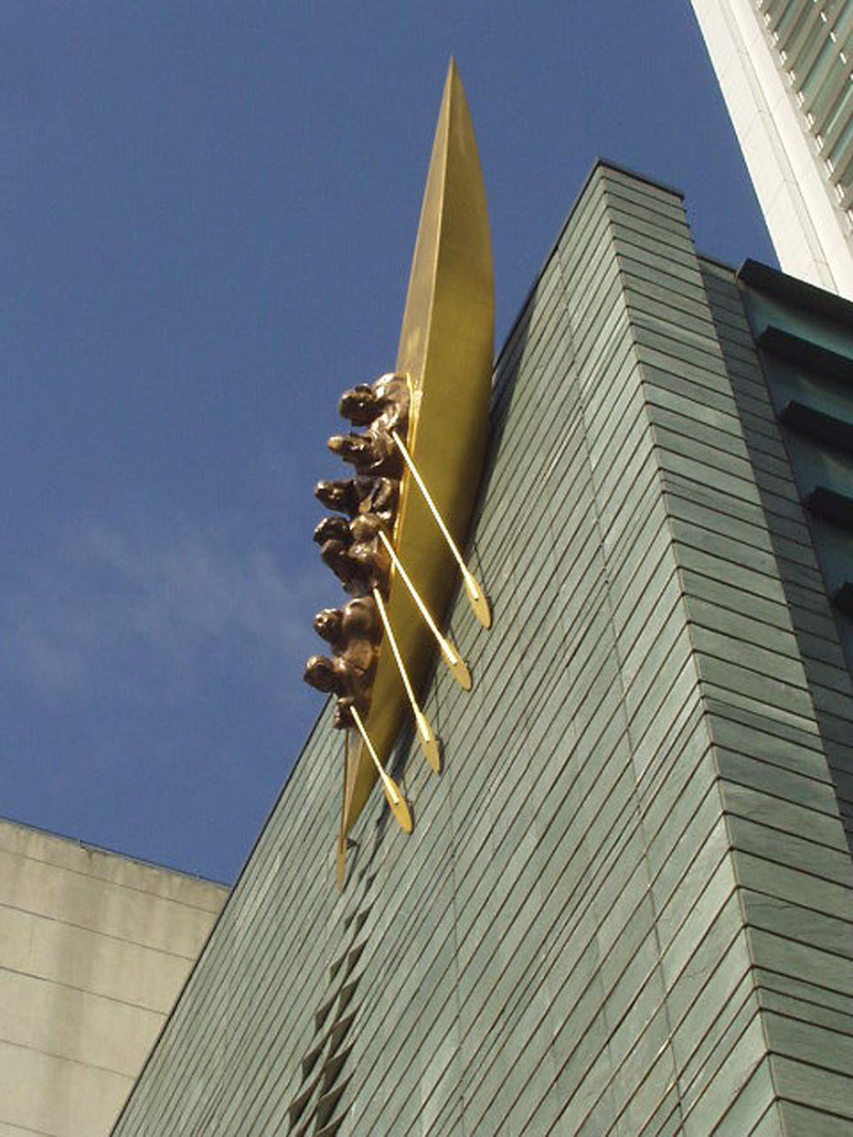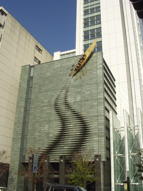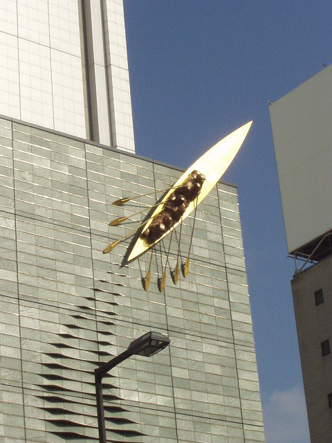 脇を流れる東横堀川から、淀川を経由して大阪の企業家が七つの海へと進出して欲しい!そんな思いが込められた支援機関の施設。「七つ」がキーワードに。なにやら、七人の侍ならぬ、七人の起業家が小さな舟で航海に出るさまが壁一面に。壁に広がる航跡の先の漕ぎ手の表情をよく見ると、何やら神々しいご尊顔。まれに通行人が手を合わせている、とかいないとか。ちなみに地元では「大阪産業創造館七福神」と呼ばれています。