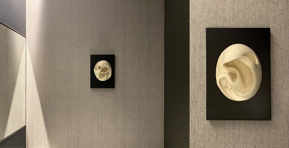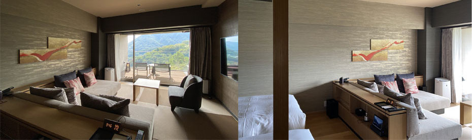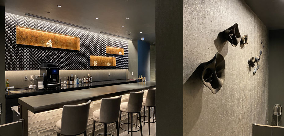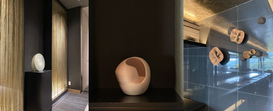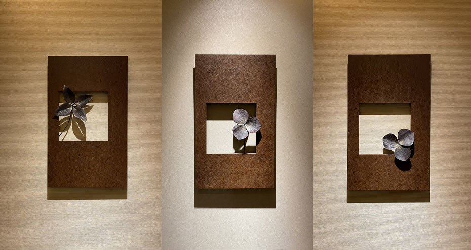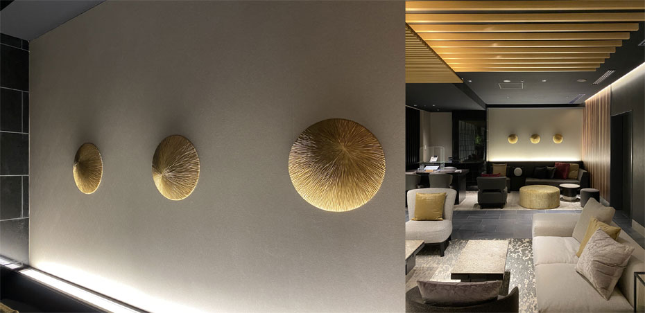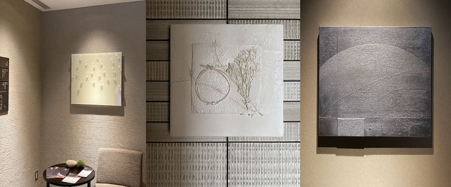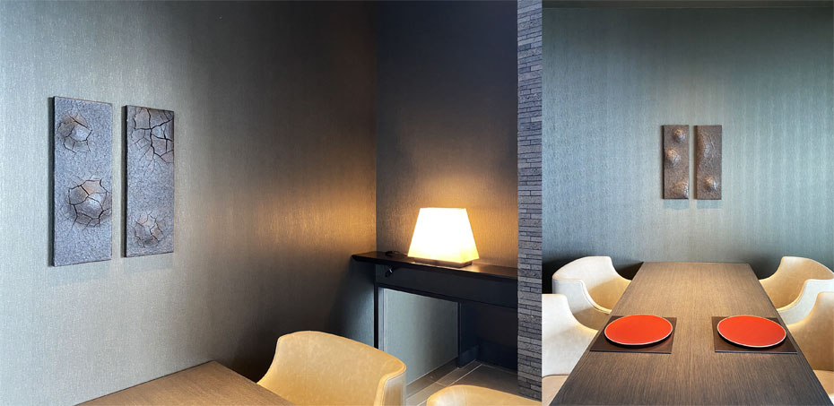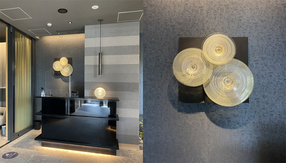 素材:(左)ガラスパネル+ガラス球、(右)パネルにアクリル絵の具 設置場所:(左)スパ、(右)メインダイニング
