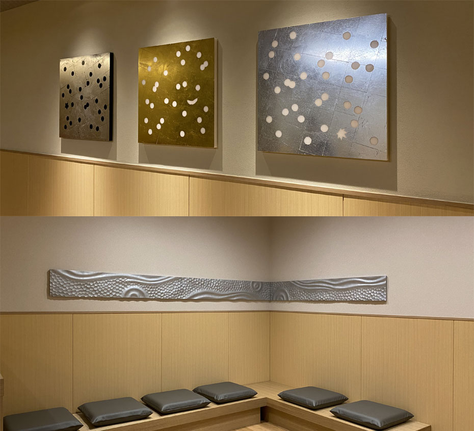 素材:(上)アクリルパネル+金箔、(下)木+ペイント 設置場所:大浴場